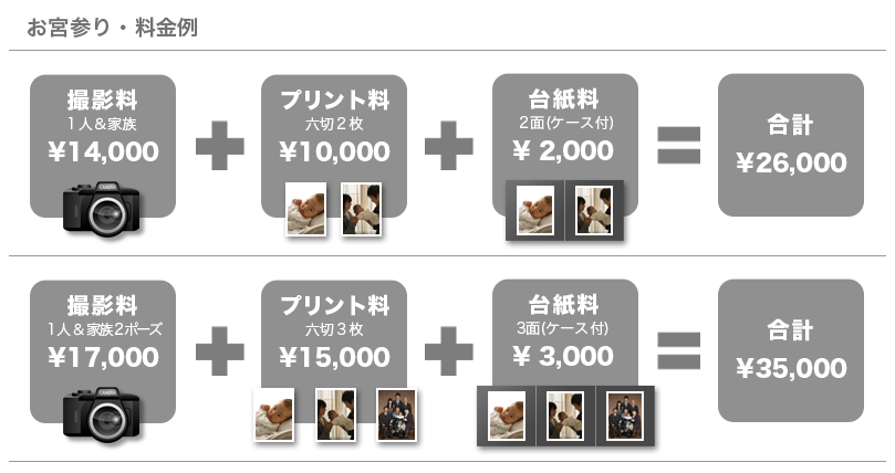 お宮参り&百日記念写真は、お子様にとって写真館での最初の記念撮影となるでしょう。表情やしぐさが魅力的なこの時期ならではの姿を写真に残しましょう。スタジオ内でやわらかい自然光をとりいれた撮影がおすすめです。